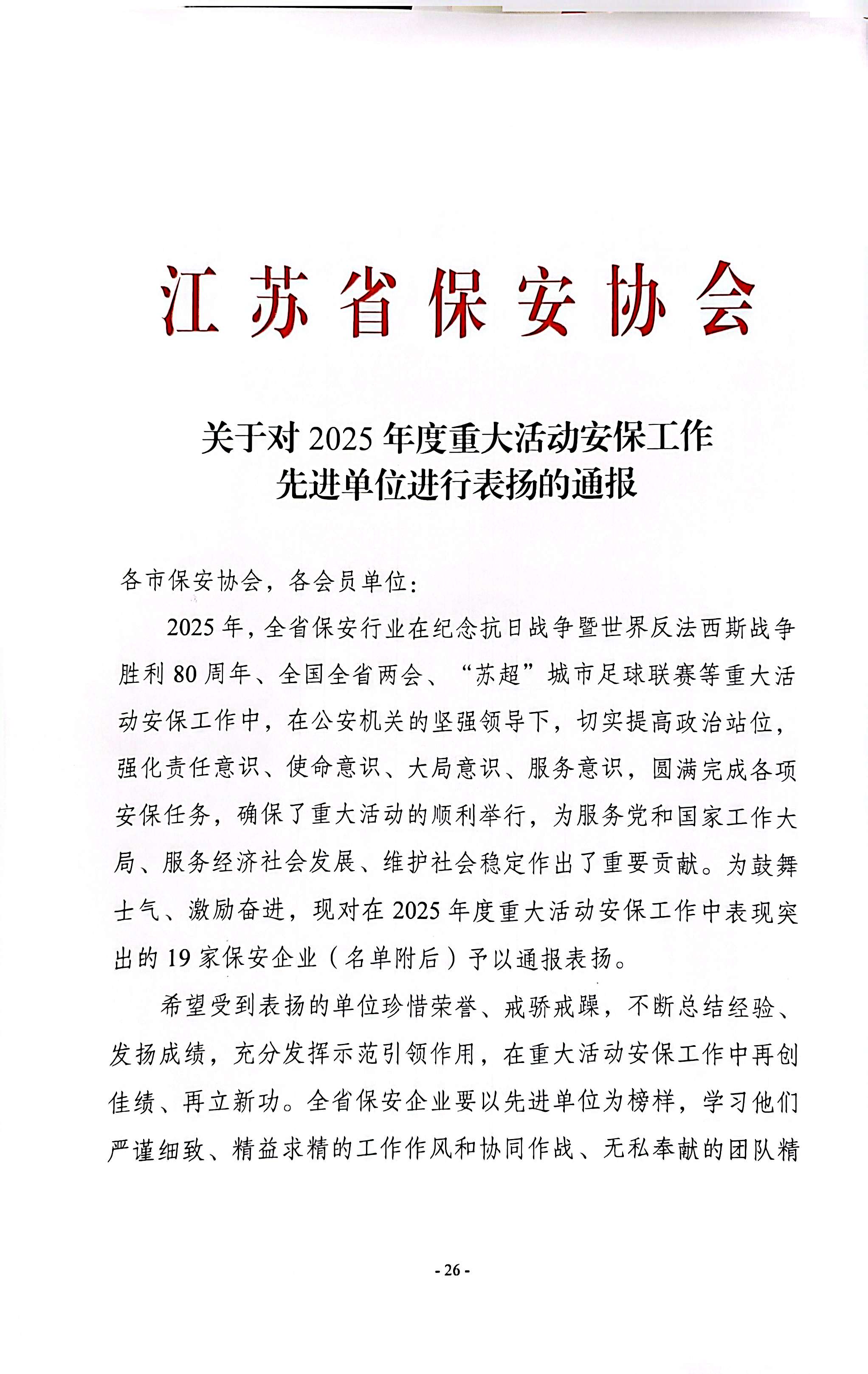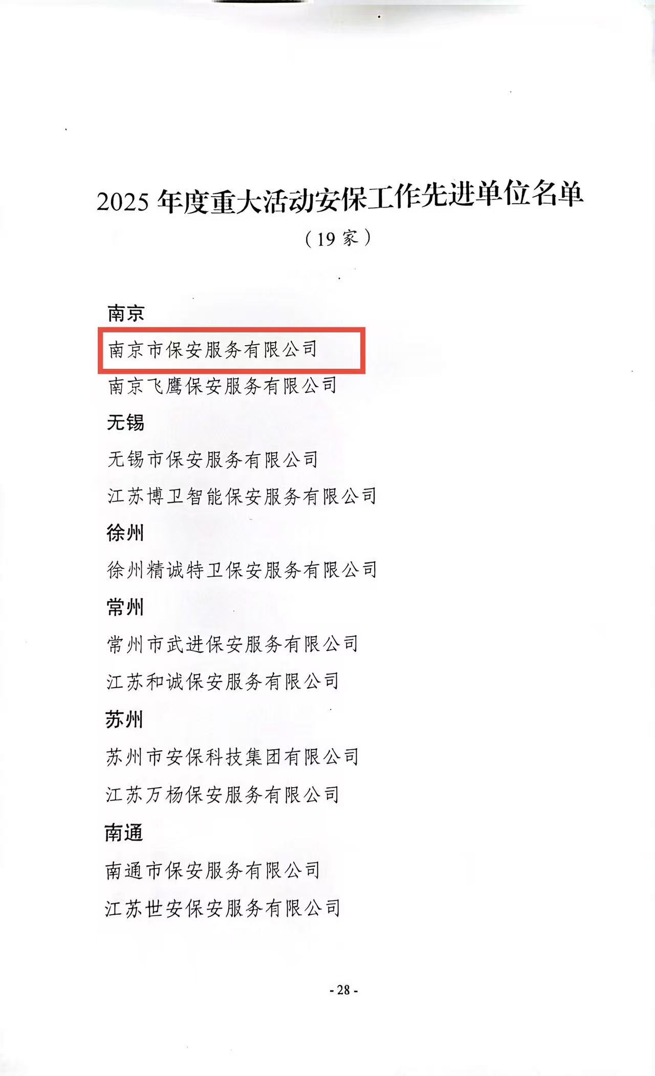1月28日,從江蘇省保安協(xié)會傳來喜訊,南京市保安服務有限公司(以下簡稱“南京市保”)被授予“2025年度重大活動安保工作先進單位”榮譽稱號。這一表彰是行業(yè)主管部門對公司專業(yè)能力與責任擔當?shù)某浞终J可,更是全體南京保安凝心聚力、實干履職的成果體現(xiàn)。