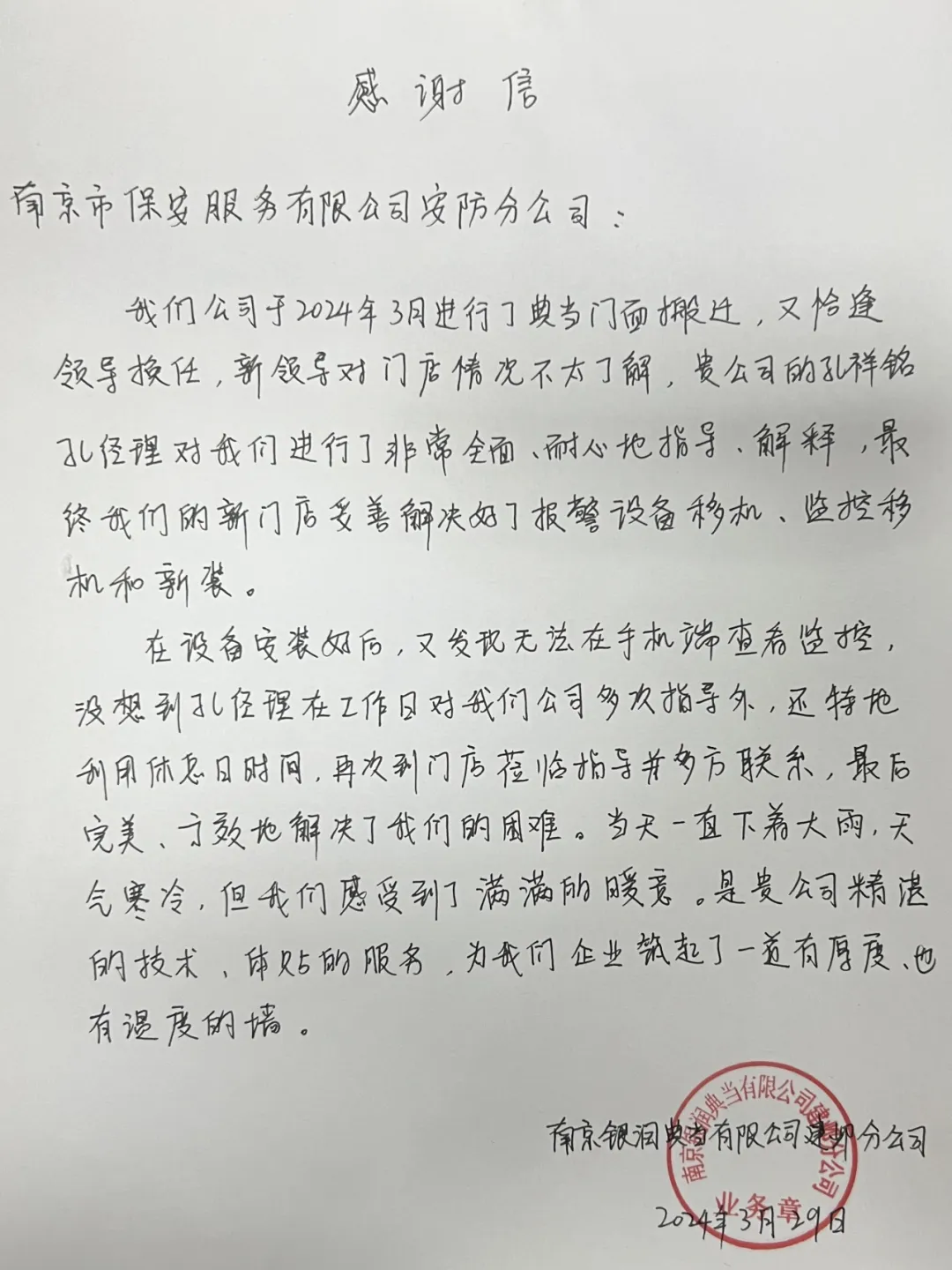 近日,南京市保安服務有限公司收到了一封來自南京銀潤典當有限公司建鄴分公司發(fā)來的感謝信,信中飽含著對公司安防部經(jīng)理孔祥銘及其安防團隊的肯定和感謝。